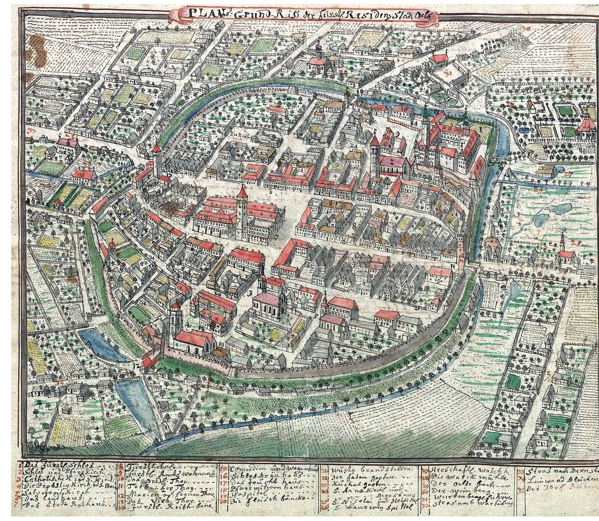 1 Das fürstliche Schloss / 2 Schloss und PfarrKirche / 3 Catholische Kirche ad S. Trinit / 4 Die Probstey Kirche ad 3 Marien / 5 Salvatoris Kirche / 6 Das Landhaus / 7 Das Stadt Rathhaus / 8 Fürstlich. / 9 Fürstl. Amtswohnung / 10 Breslauer Tor / 11 Trebnitzer Tor / 12 Marien oder Frauentor / 13 Viehtor / 14 Fürstl. Reitbahn / 15 Comodien und Wagenhaus / 16 Schlossbräu Haus / 17 Das Zouchthaus / 18 Pfarrwitwenhaus / 19 Hospital / 20 Die Fleischbänke / 21 Wüste Brandstellen / 22 Fasangarten / 23 Küchengarten / 24 St. Anna Kirchl und Begräbnis / 25 S.Nicolai und Hospital / 26 Laurenty Spital / 27 Herrschaftl. Waschhaus /28 Walkmühle / 29 Oelsebach / 30 Weinberg / 31 Würtenbergische Fuhrwerk / 32 Strasse nach Wartenberg / 33 Strasse nach Bernstadt / Leinwandbleiche / 34 Das Dorf Rat